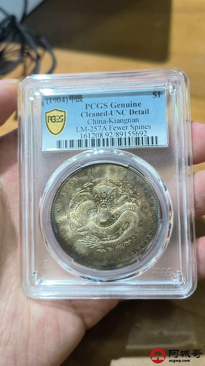 Lot:1383 1904甲辰年江南省造光绪元宝库平七钱二分银币一枚,彩光底板,未使用 PCGS UNC92评级编号:89155692