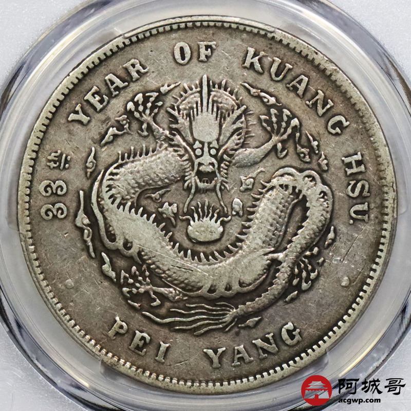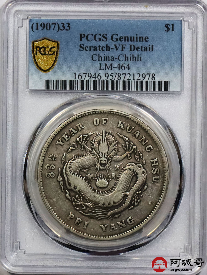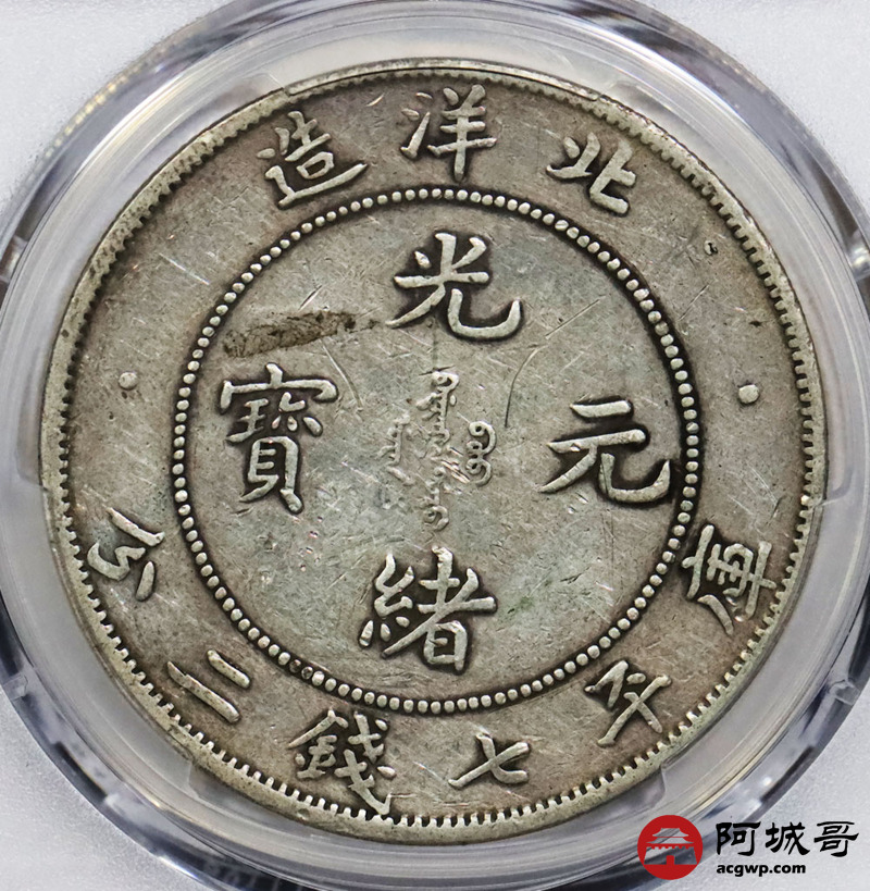 Lot:1639 1907光绪三十三年北洋造光绪元宝库平七钱二分银币一枚,原味PCGS VF95评级编号:87212978