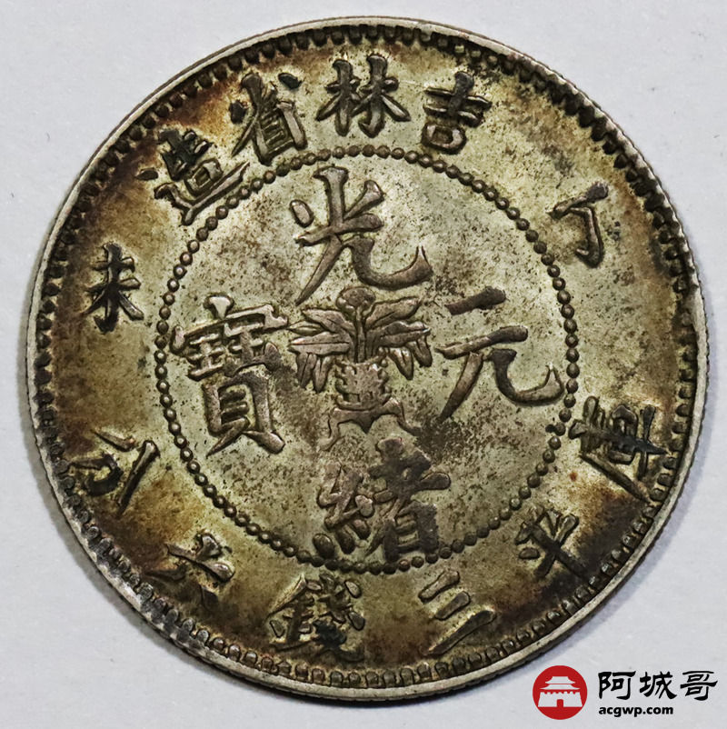 Lot:1420 1907丁未年吉林省造光绪元宝库平三钱六分银币一枚,五彩包浆,未使用状态