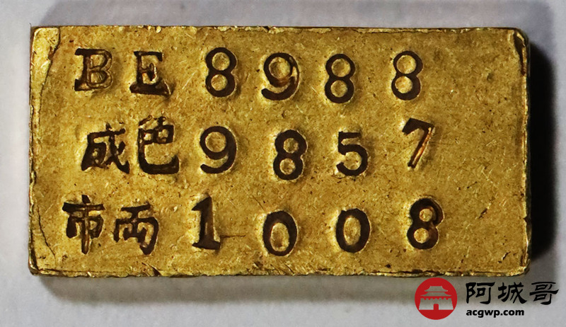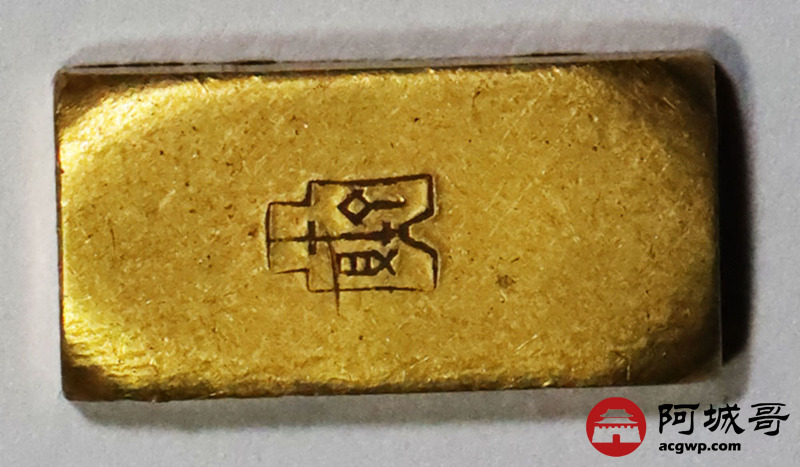 Lot:1522 民国时期上海中央造币厂徽布图一两金厂条一枚,31.3g