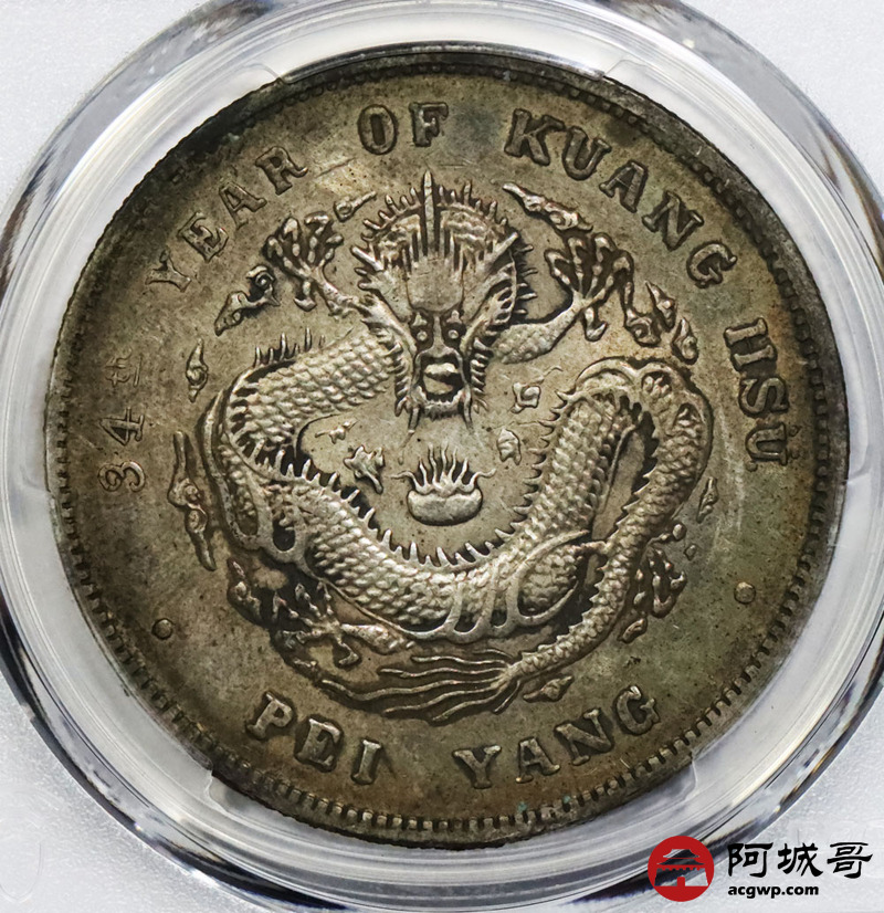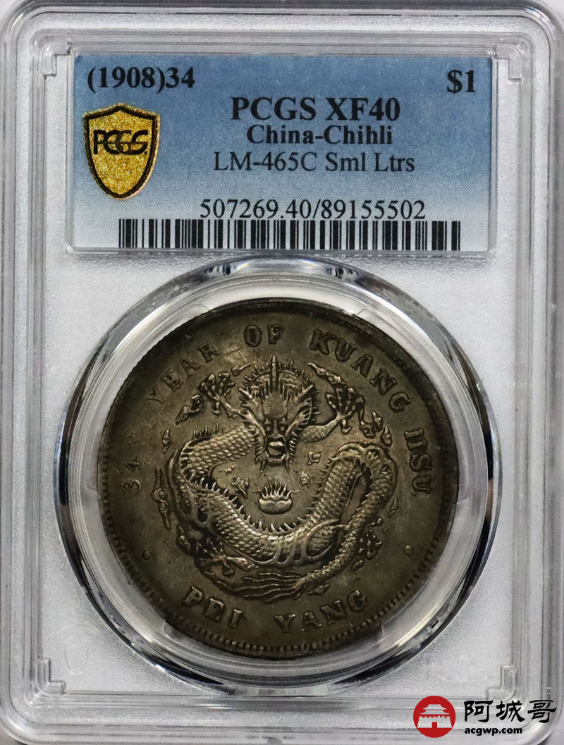 Lot:1612 1908光绪三十四年北洋造光绪元宝库平七钱二分银币一枚,小字版,酱彩包浆 PCGS XF40评级编号:89155502