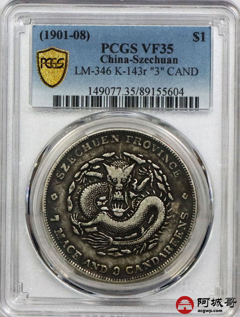 Lot:1424 1901-08年四川省造光绪元宝库平七钱三分银币一枚 ,原味 PCGS VF35评级编号:89155604