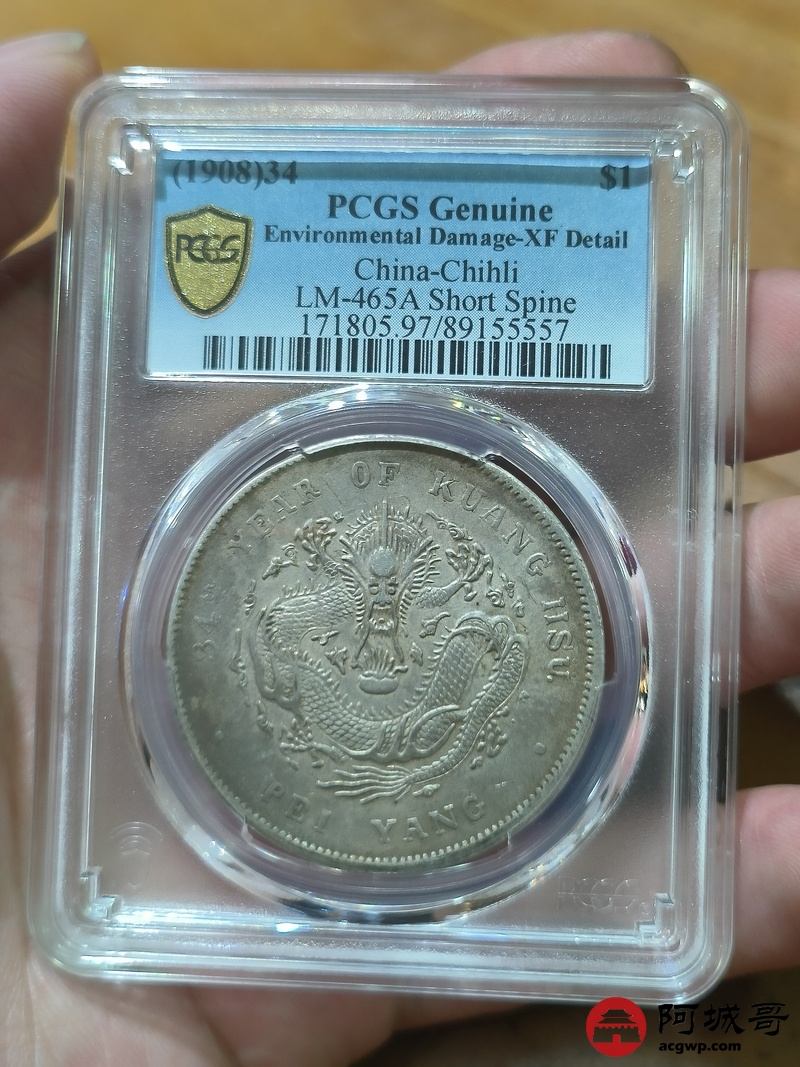 Lot:1706 1908光绪三十四年北洋造光绪元宝库平七钱二分银币一枚,短尾版,原味 PCGS XF97评级编号:89155557