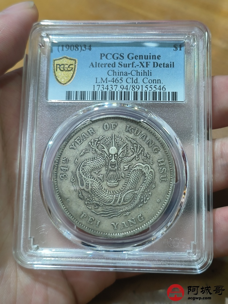 Lot:1704 1908光绪三十四年北洋造光绪元宝库平七钱二分银币一枚,原味PCGS XF94评级编号:89155546