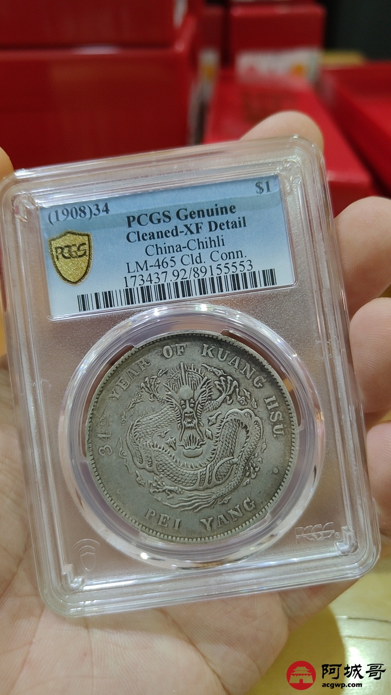 Lot:1567 1908光绪三十四年北洋造光绪元宝库平七钱二分银币一枚,原味 PCGS XF92评级编号:89155553