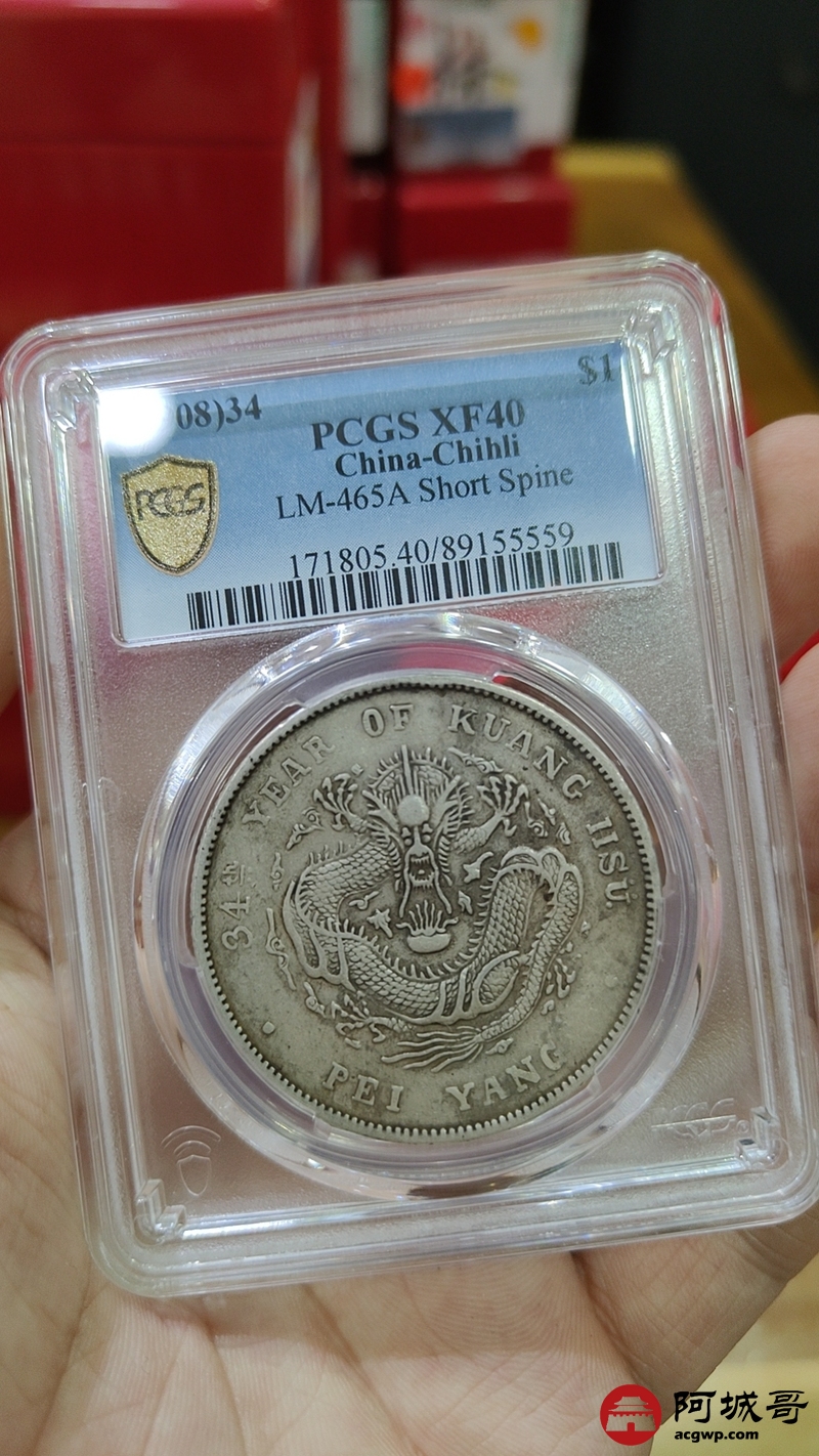Lot:1614 1908光绪三十四年北洋造光绪元宝库平七钱二分银币一枚,短尾龙,原味 PCGS XF40评级编号:89155559