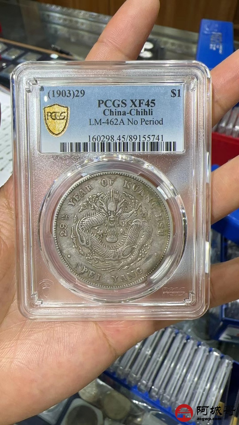 Lot:1595 1903光绪二十九年北洋造光绪元宝库平七钱二分银币一枚,原味 PCGS XF45评级编号:89155741