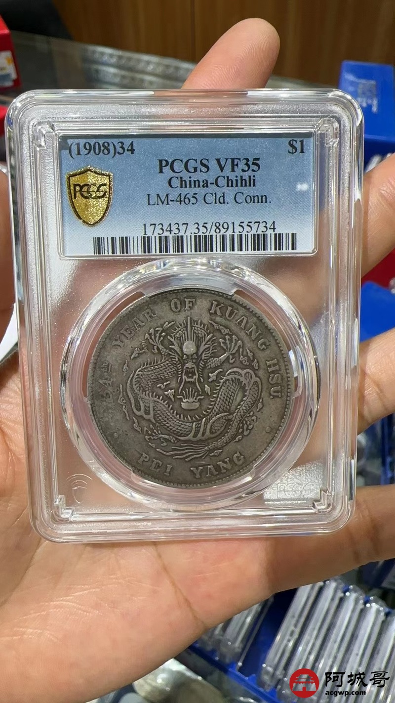 Lot:1589 1908光绪三十四年北洋造光绪元宝库平七钱二分银币一枚,原味 PCGS VF35评级编号:89155734