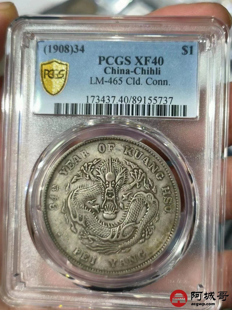 Lot:1586 1908光绪三十四年北洋造光绪元宝库平七钱二分银币一枚,原味 PCGS XF40评级编号:89155737