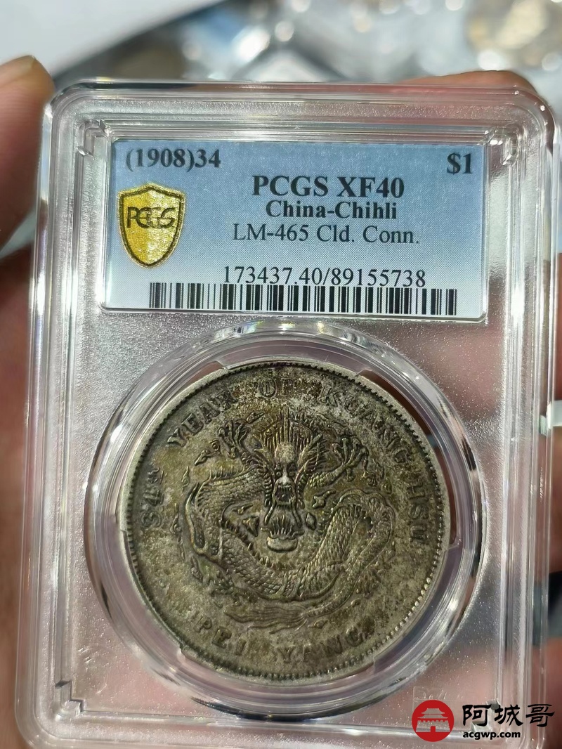 Lot:1585 1908光绪三十四年北洋造光绪元宝库平七钱二分银币一枚,原味五彩底板 PCGS XF40评级编号:89155738