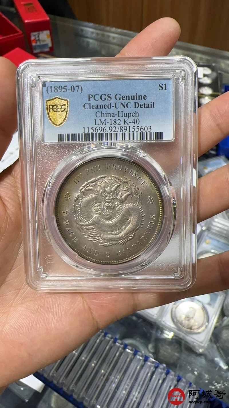 Lot:1334 1895-07年湖北省造光绪元宝库平七钱二分银币一枚,彩光底板,未使用 PCGS UNC92评级编号:89155603