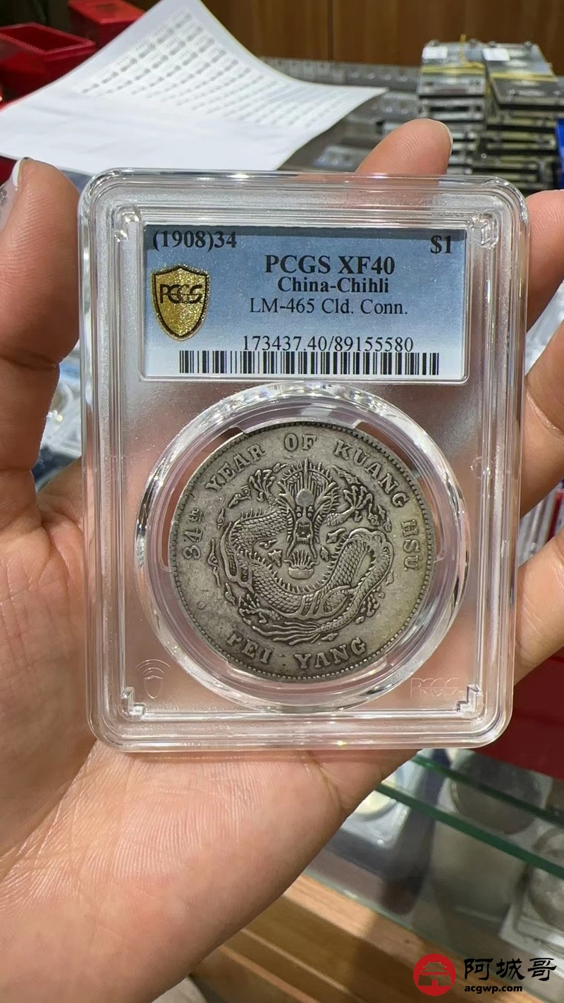 Lot:1596 1908光绪三十四年北洋造光绪元宝库平七钱二分银币一枚,原味 PCGS XF40评级编号:89155580