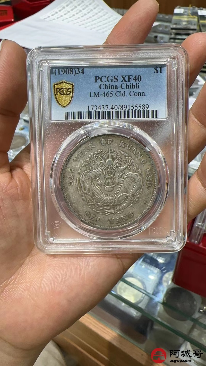 Lot:1687 1908光绪三十四年北洋造光绪元宝库平七钱二分银币一枚,原味PCGS XF40评级编号:89155589