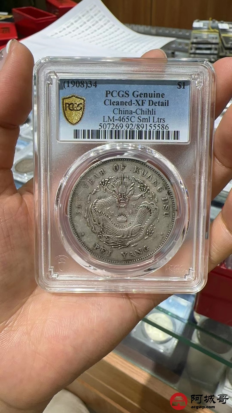 Lot:1599 1908光绪三十四年北洋造光绪元宝库平七钱二分银币一枚,小字版,原味 PCGS XF92评级编号89155586