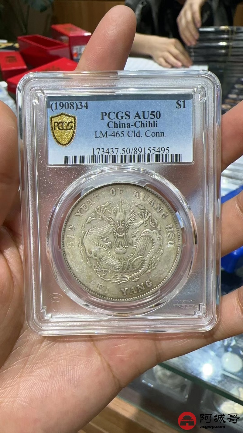 Lot:1692 1908光绪三十四年北洋造光绪元宝库平七钱二分银币一枚,原味PCGS AU50评级编号:89155495