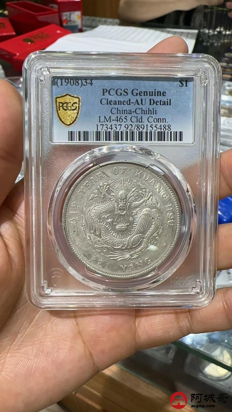 Lot:1695 1908光绪三十四年北洋造光绪元宝库平七钱二分银币一枚,PCGS AU92评级编号:89155488