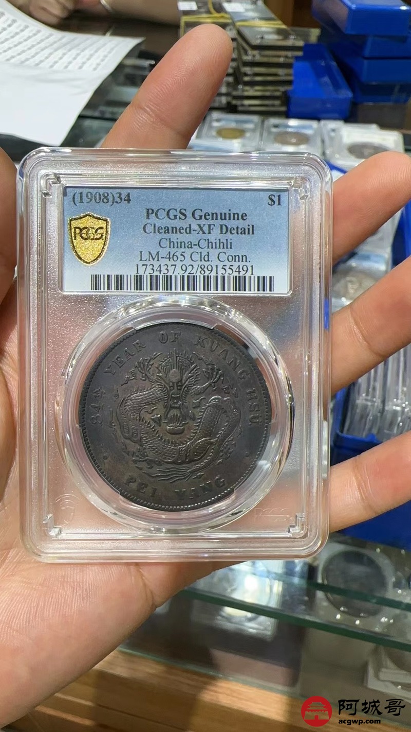Lot:1697 1908光绪三十四年北洋造光绪元宝库平七钱二分银币一枚,底板氧化黑彩 PCGS XF92评级编号:89155491