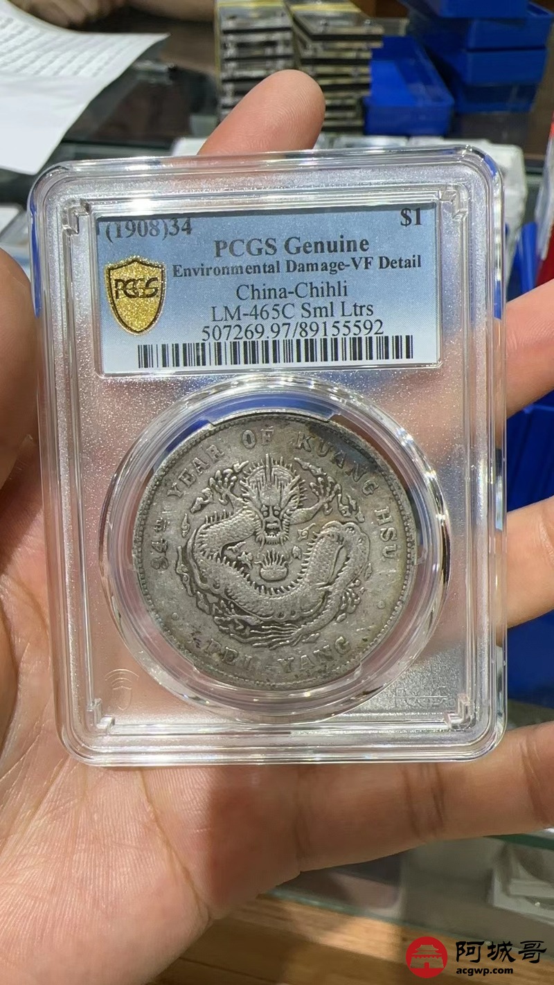 Lot:1701 1908光绪三十四年北洋造光绪元宝库平七钱二分银币一枚,小字版,原味PCGS VF97评级编号:89155592