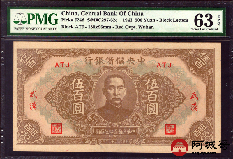 Lot:72 民国32年 中央储备银行 伍佰圆 武汉地名 加盖武汉地名少见 PMG 63EPQ
