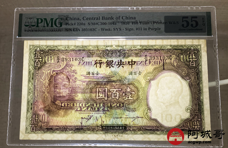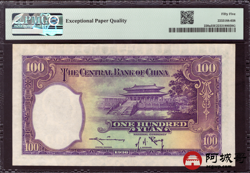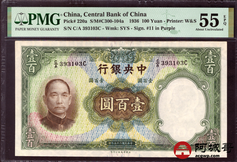 Lot:57 民国25年 中央银行 壹佰圆 PMG 55EPQ
