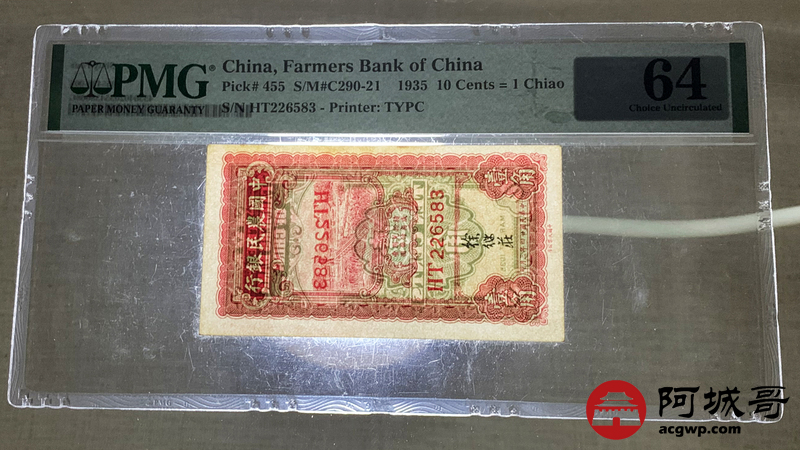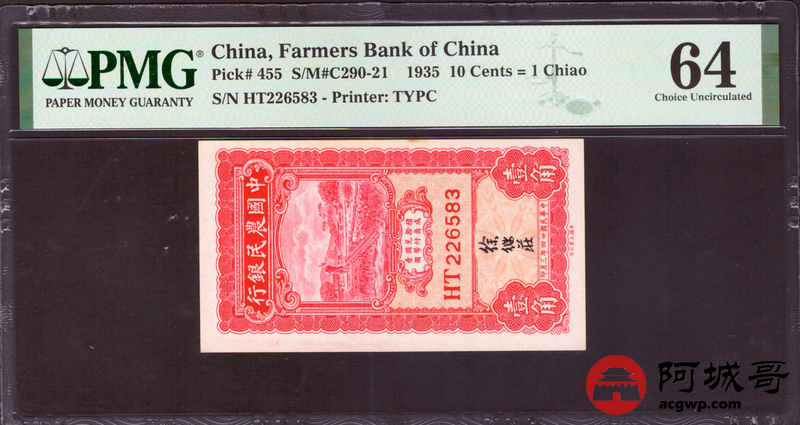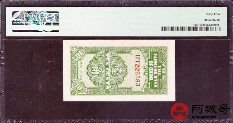 Lot:76 民国24年 中国农民银行 壹角 PMG 64
