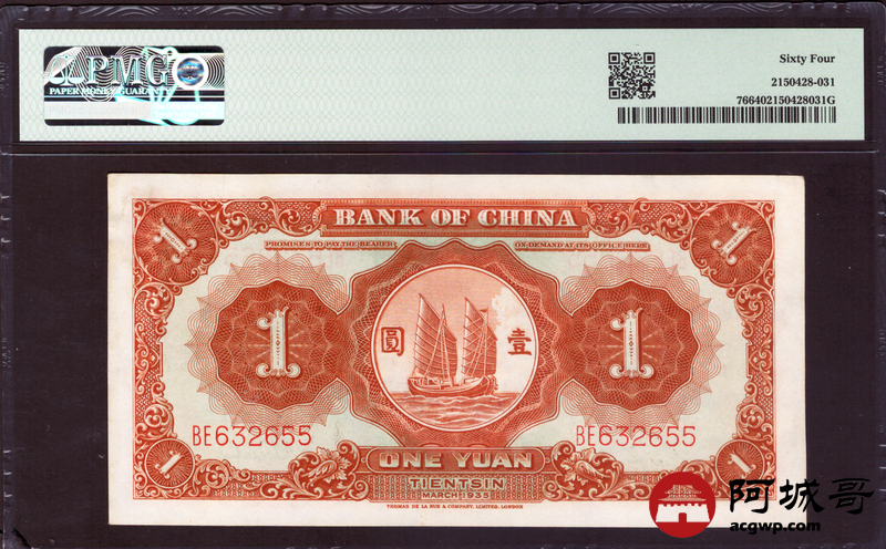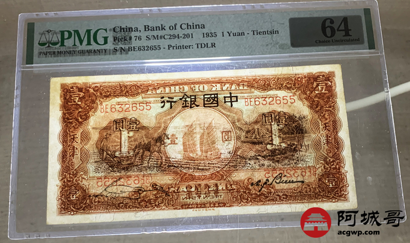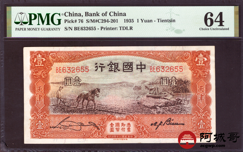 Lot:75 民国24年 马拉犁中国银行 壹圆 天津地名 无47 PMG 64