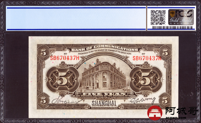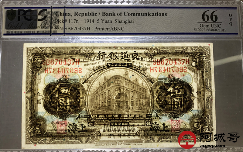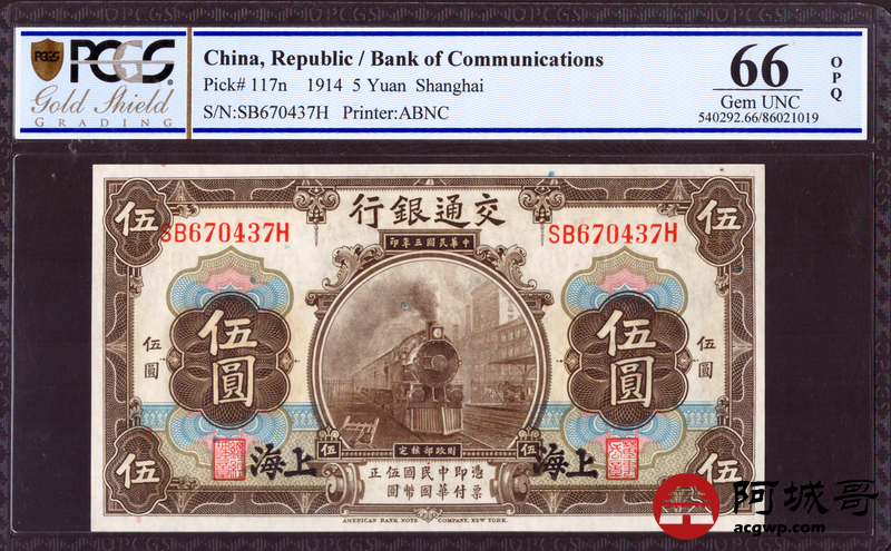 Lot:24 民国3年交通银行 伍圆 PCGS 66OPQ