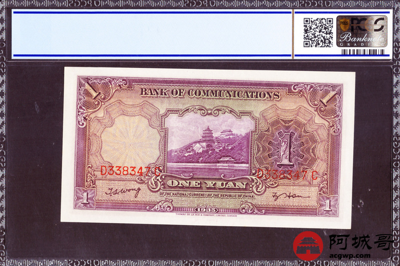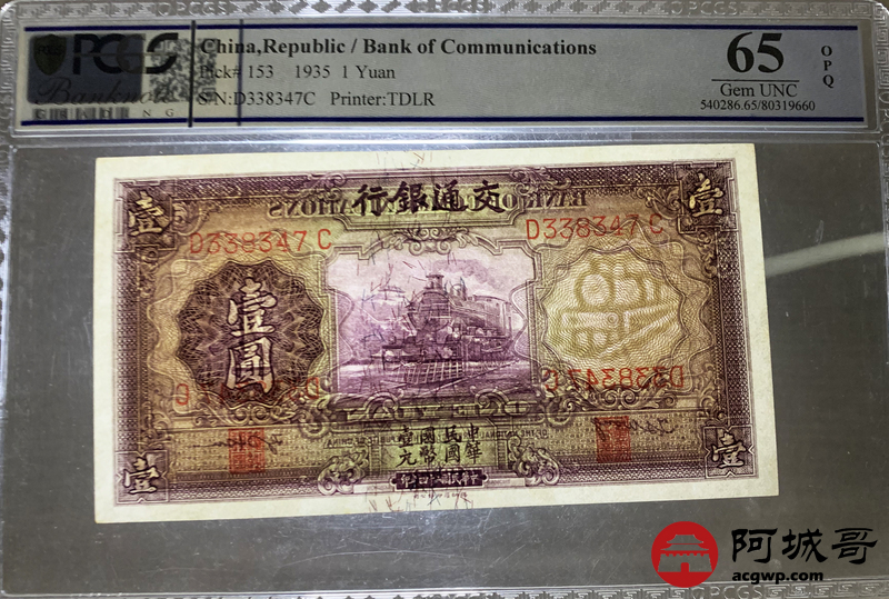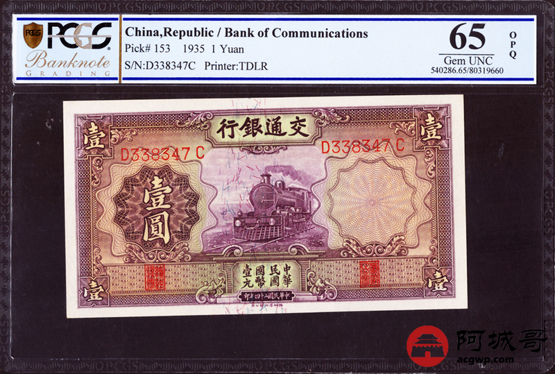 Lot:28 民国24年交通银行壹圆 PCGS 65OPQ