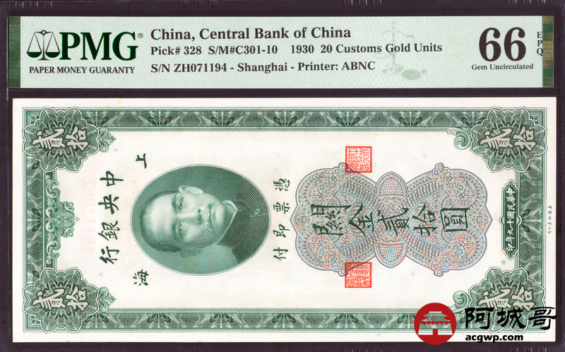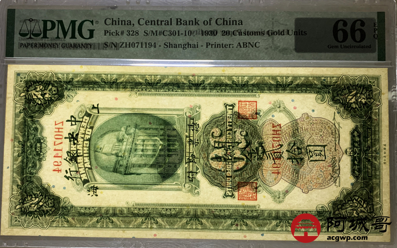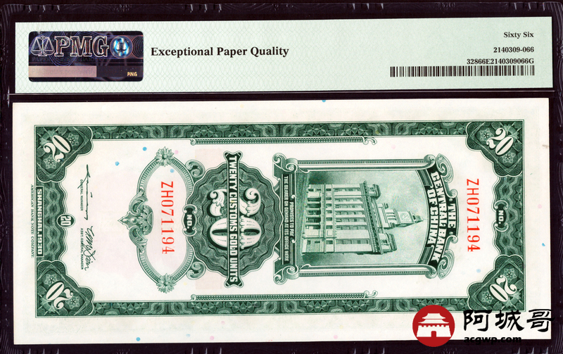 Lot:33 民国19年 中央银行 关金贰拾圆 PMG 66EPQ