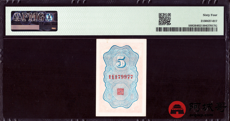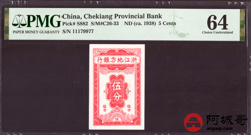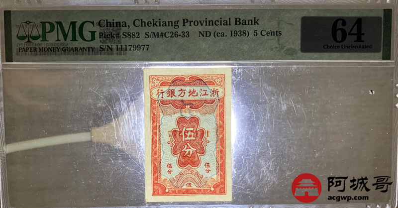 Lot:32 浙江地方银行 伍分 无4 PMG 64 数三号