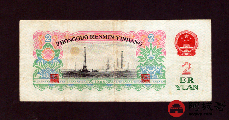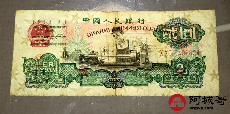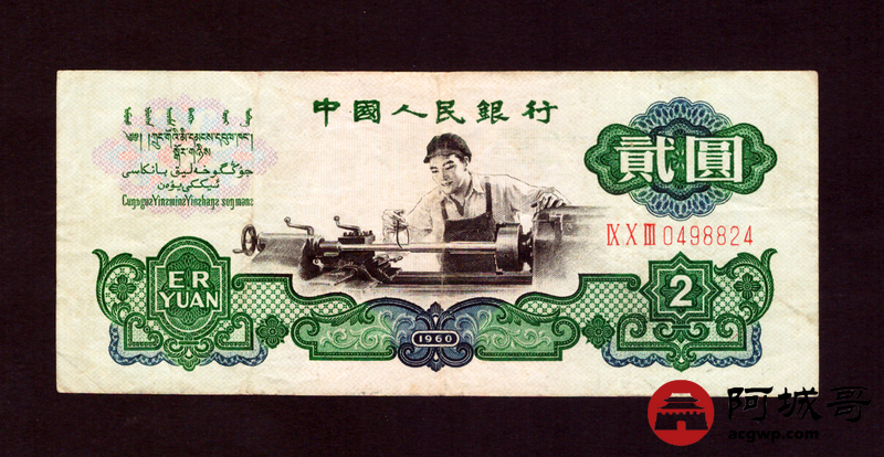 Lot:68 三版 1960年 贰圆车工 五星水印 7成新