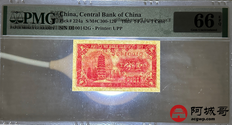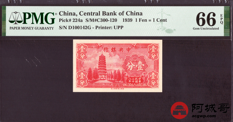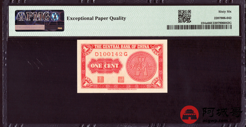Lot:31 民国28年 中央银行 壹分 PMG 66EPQ
