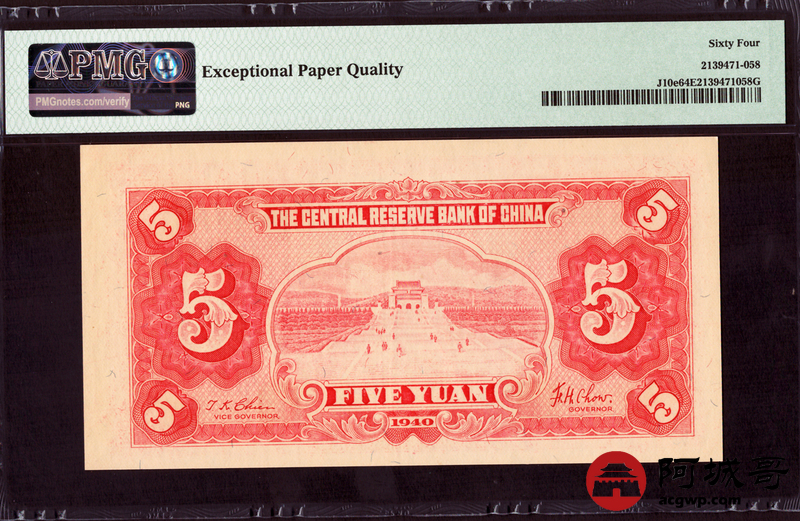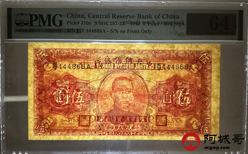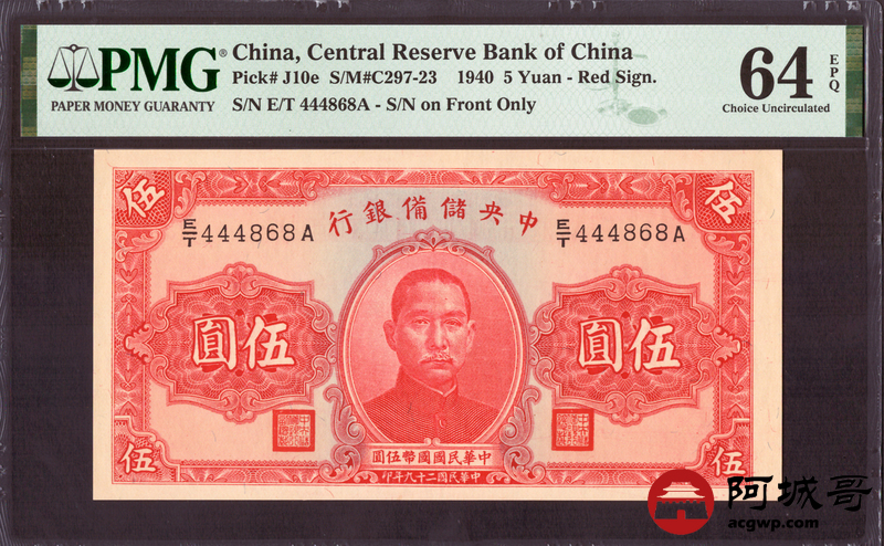 Lot:80 民国29年 中央储备银行 伍圆 PMG 64EPQ 尾号868