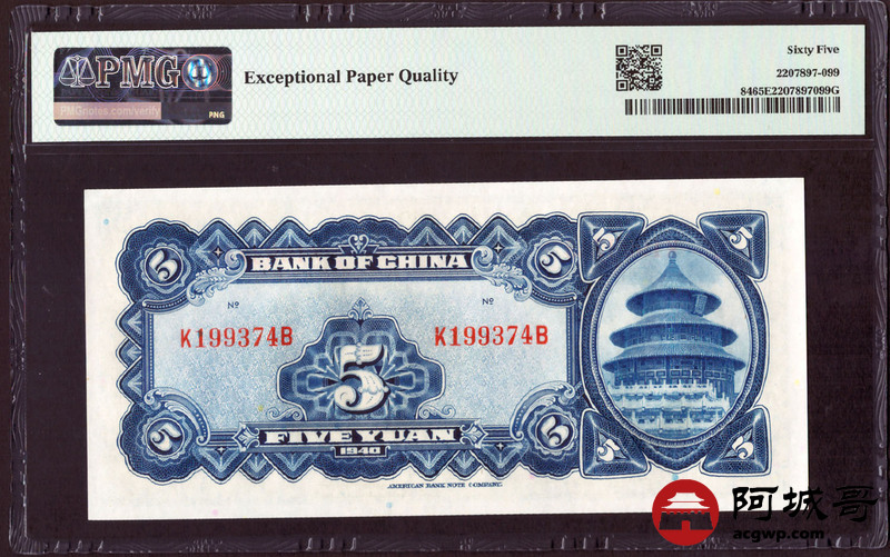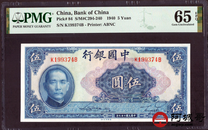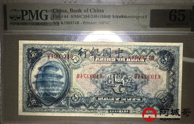 Lot:5 民国29年 中国银行 伍圆 PMG 65EPQ