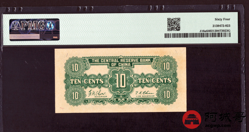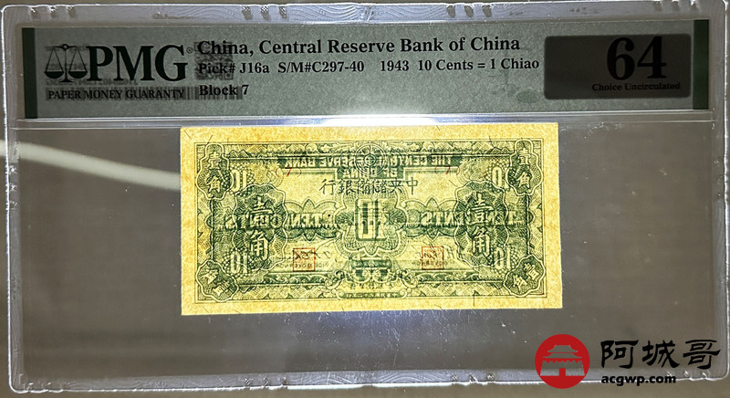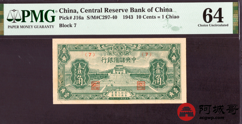 Lot:2 民国32年 中央储备银行 壹角 PMG 64