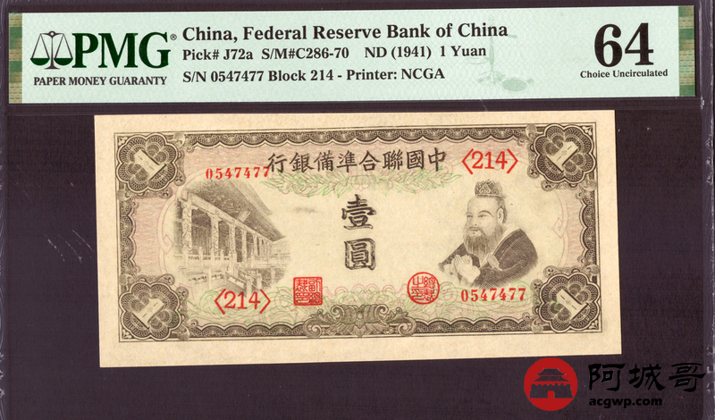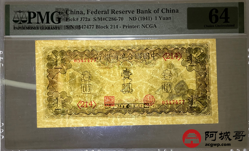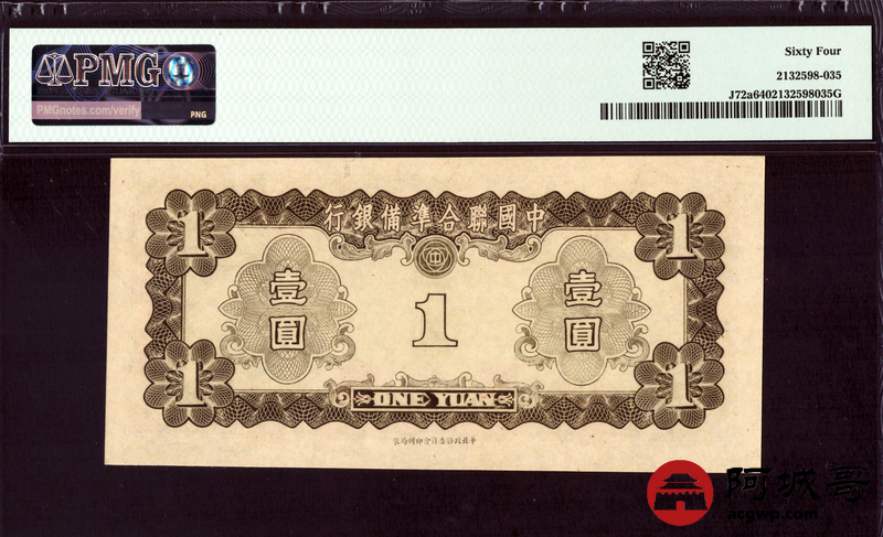 Lot:58 中国联合准备银行 壹圆 (1941年) PMG 64