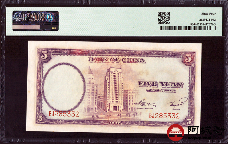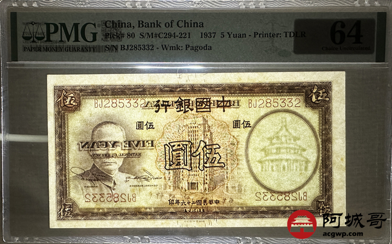 Lot:12 民国26年 中国银行 伍圆 PMG 64 好号无47