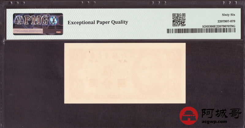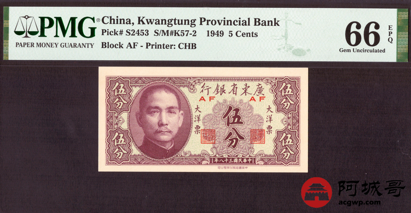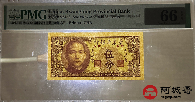 Lot:34 民国38年 广东省银行 伍分 PMG 66EPQ