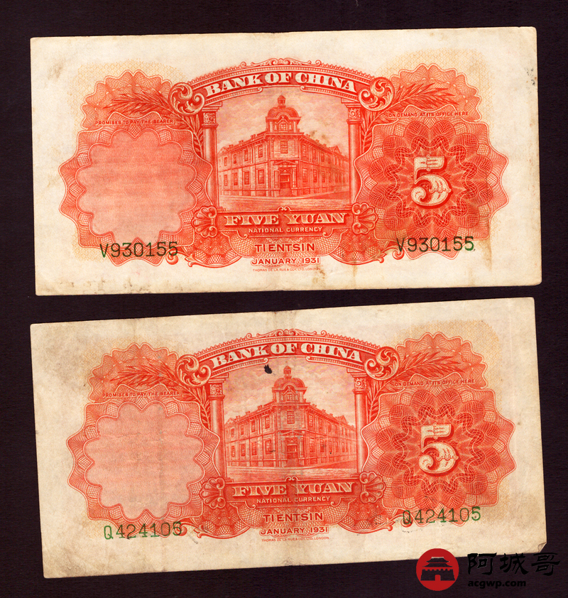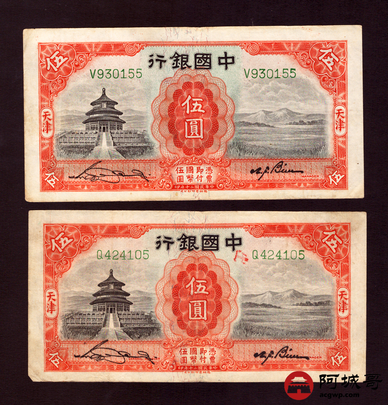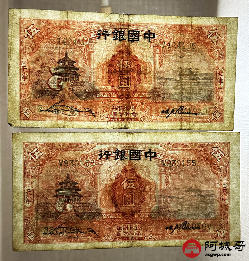 Lot:35 民国20年 中国银行 伍圆 天津地名 两张一组 72成新