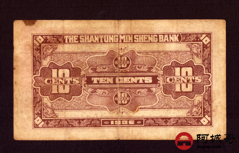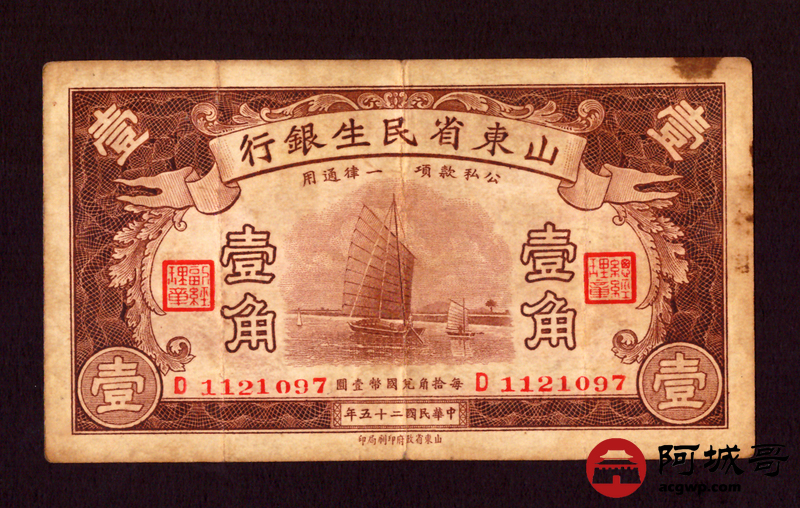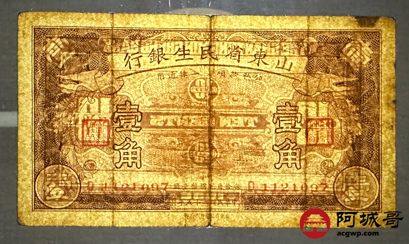 Lot:1 民国25年 山东省民生银行 壹角 69成新·