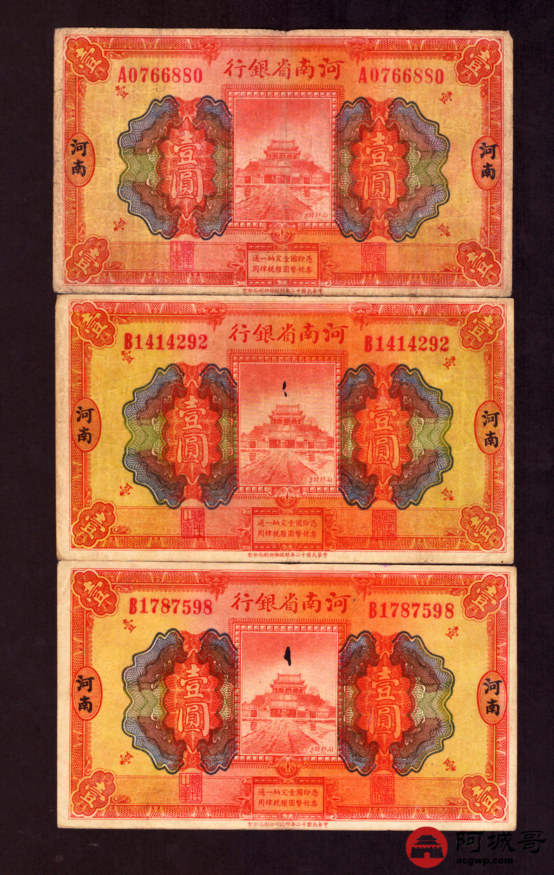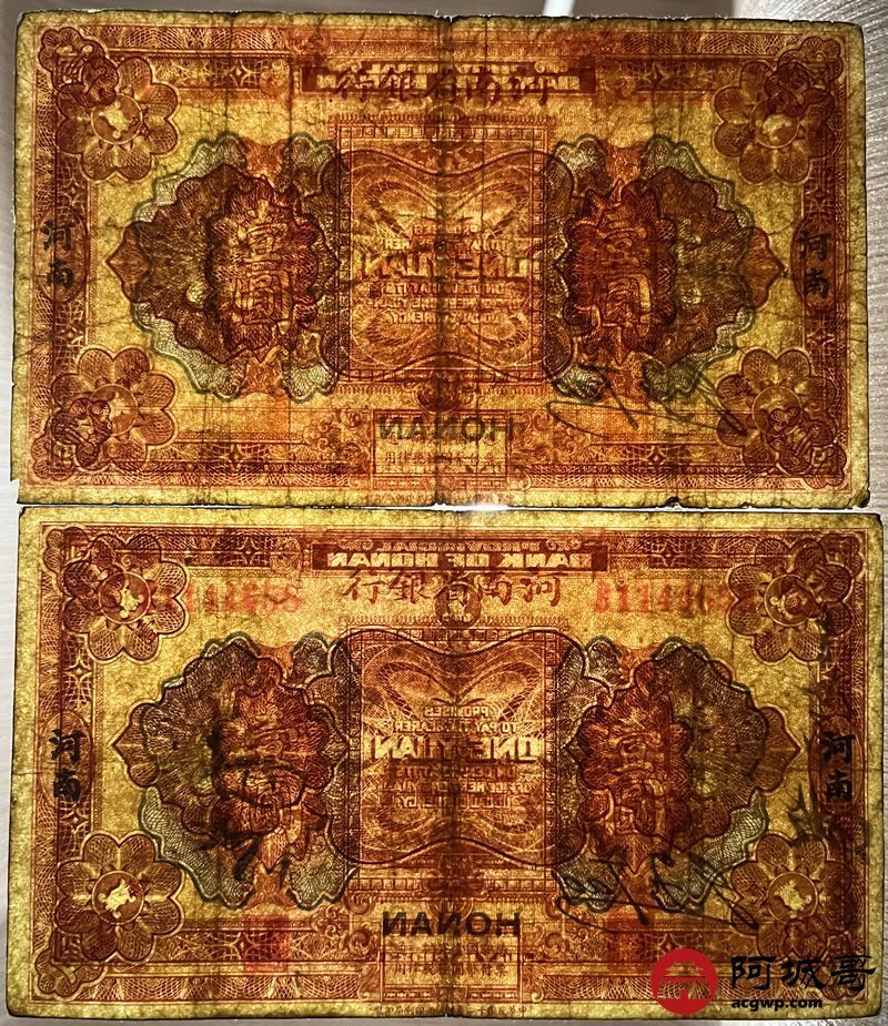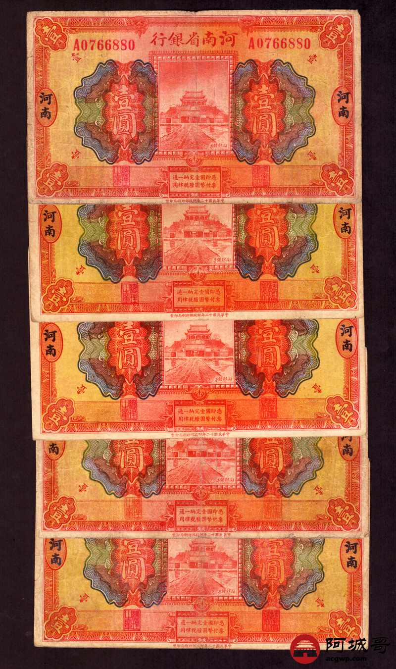 Lot:44 民国12年 河南省银行 壹圆 地名河南 5张 67至75成新 两张中间有孔