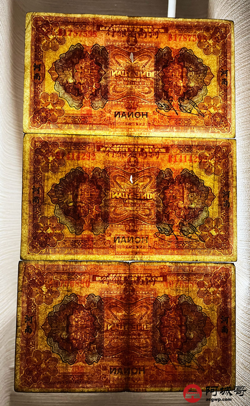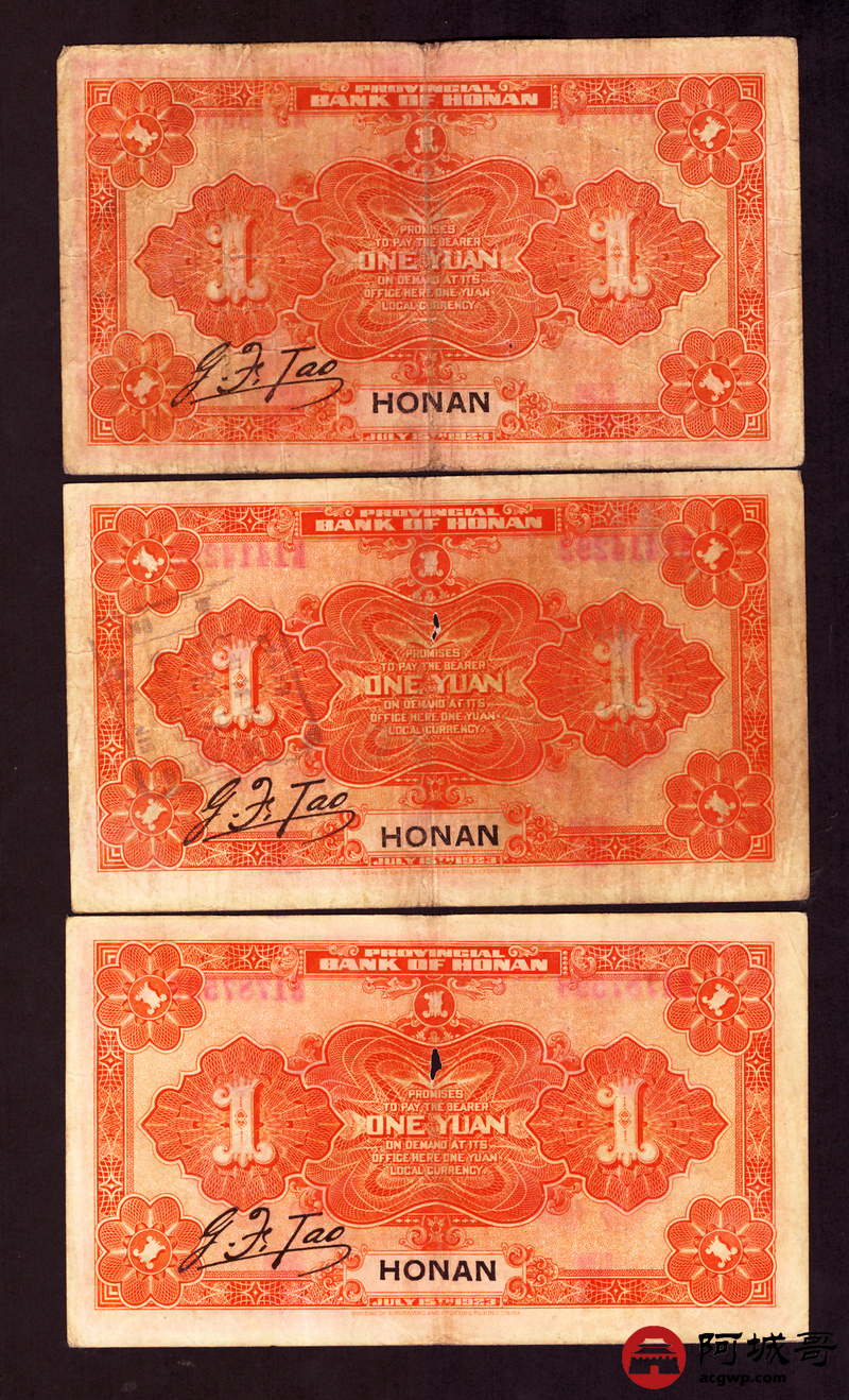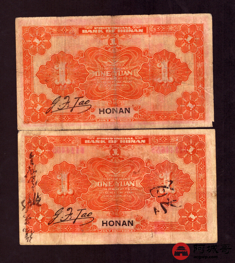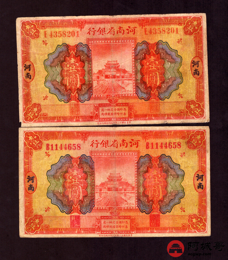 Lot:44 民国12年 河南省银行 壹圆 地名河南 5张 67至75成新 两张中间有孔