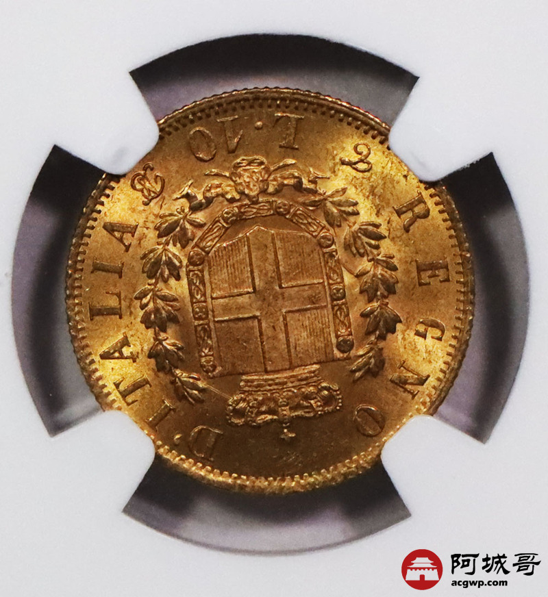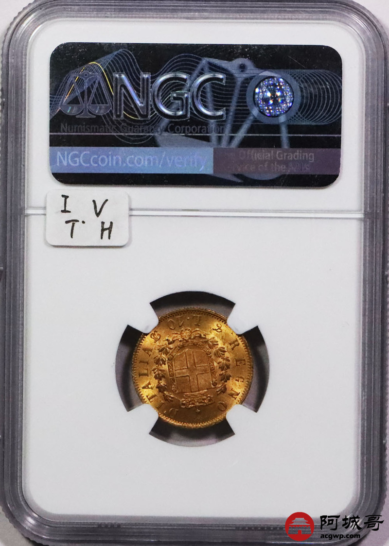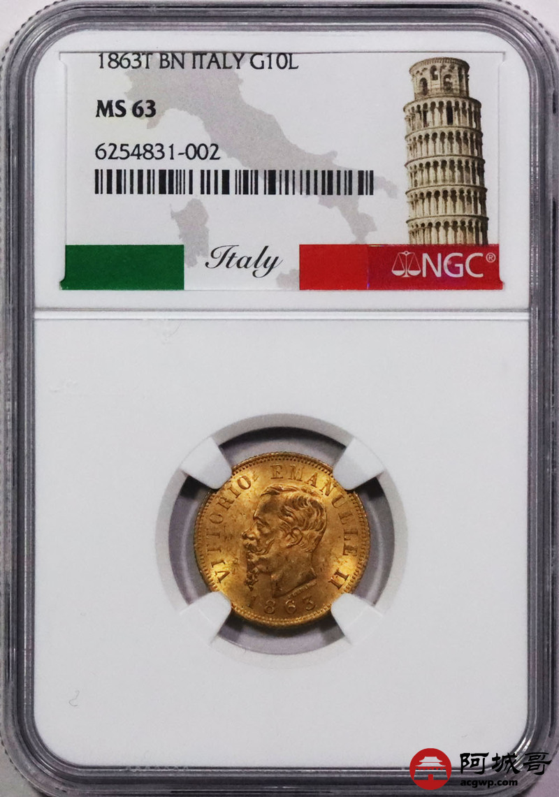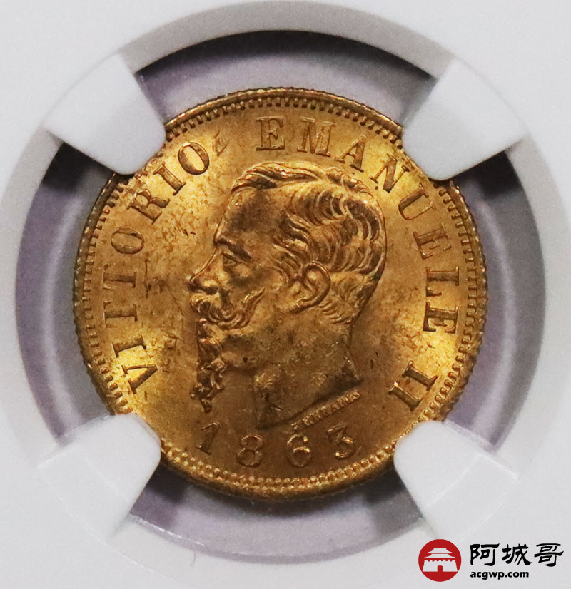 Lot:7 1863意大利 艾曼扭尔 二世 10里拉 金币 NGC MS63