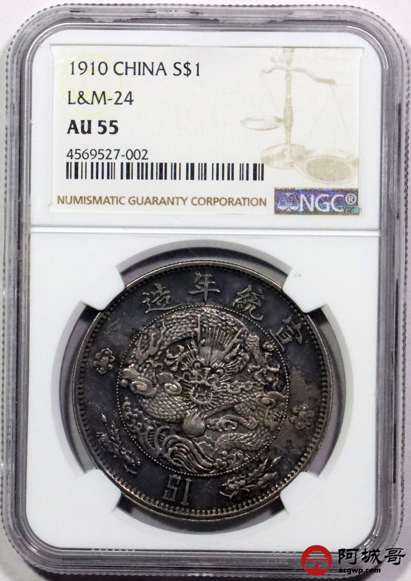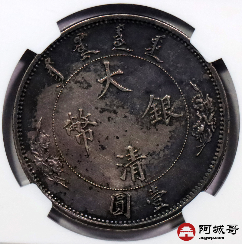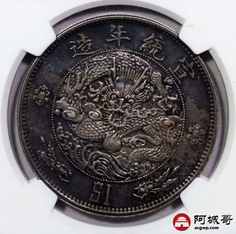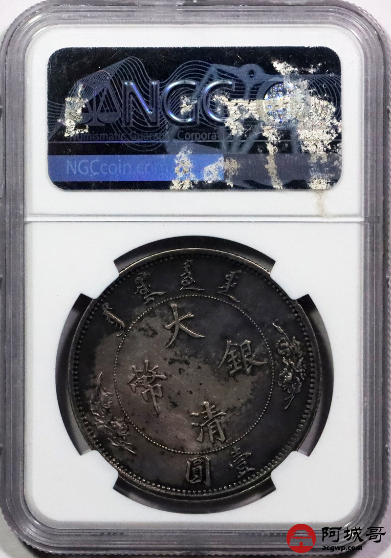 Lot:12 深打 酱黑包浆 大清宣二水龙壹圆 NGC AU55