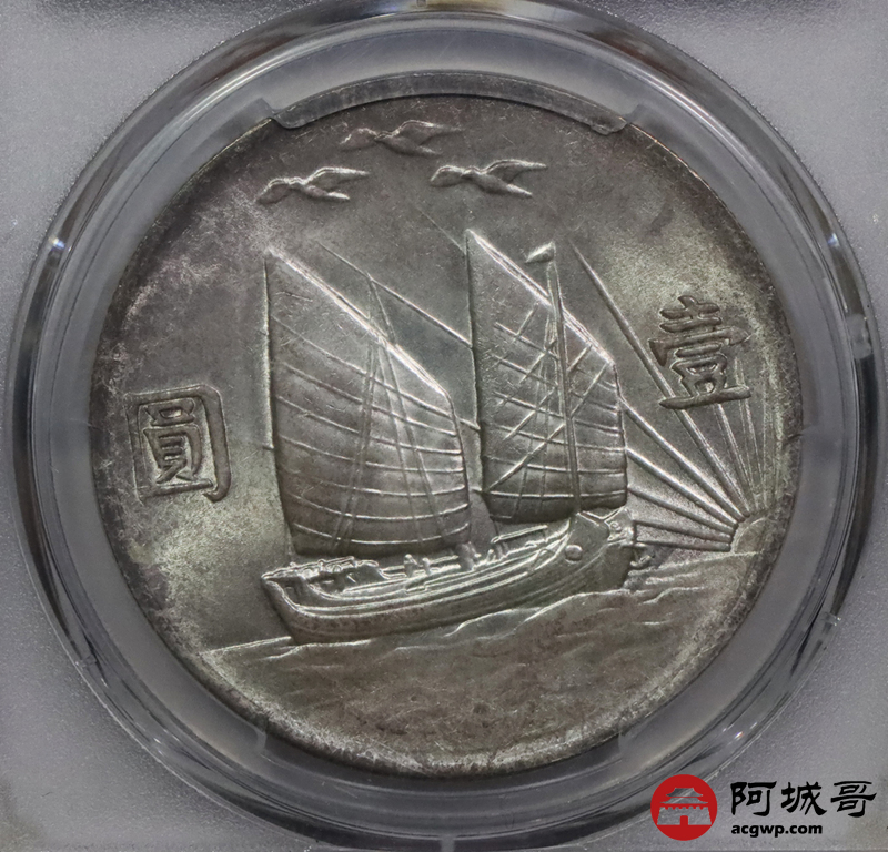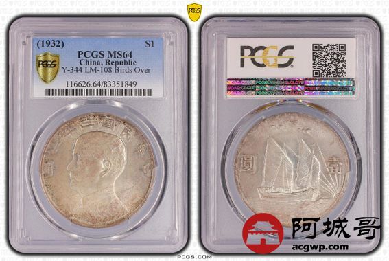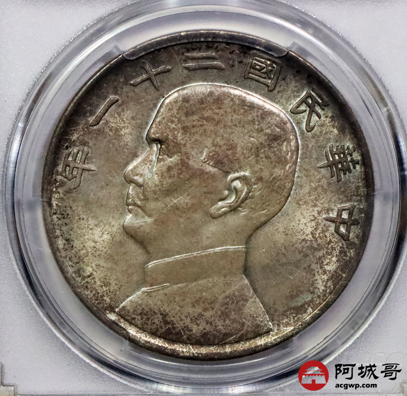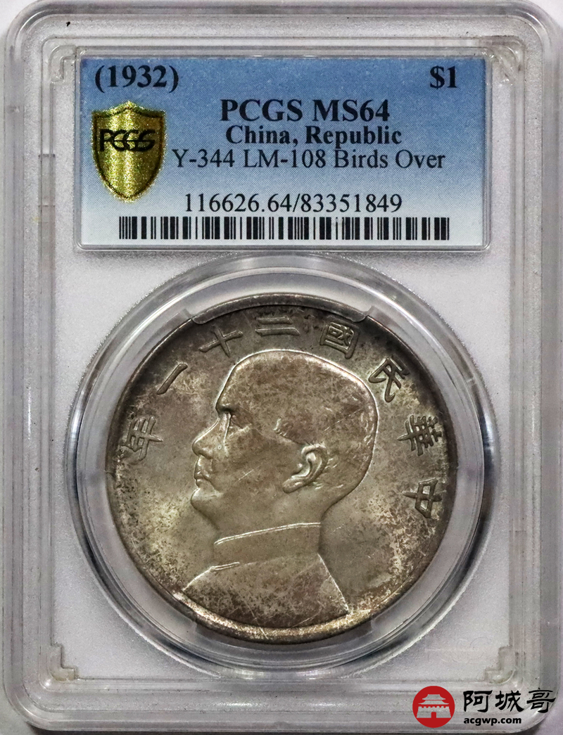 Lot:9 淡彩转光 民国二十一年孙像三鸟壹圆 PCGS MS64