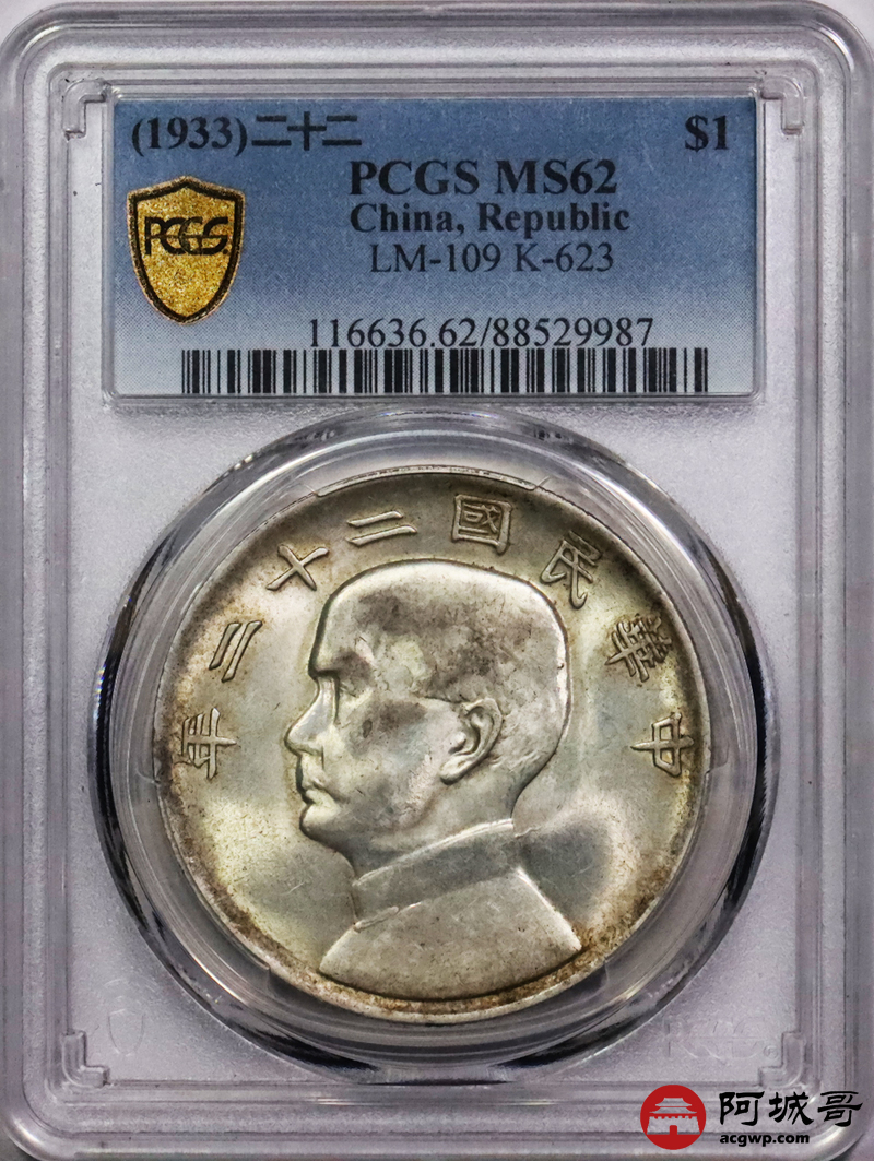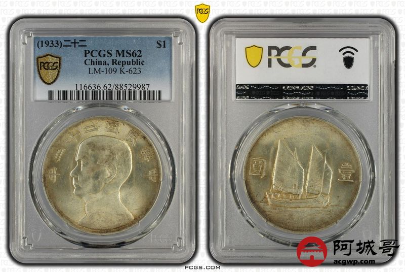 Lot:8 黄油彩 民国22年船洋 壹元 PCGS MS 62