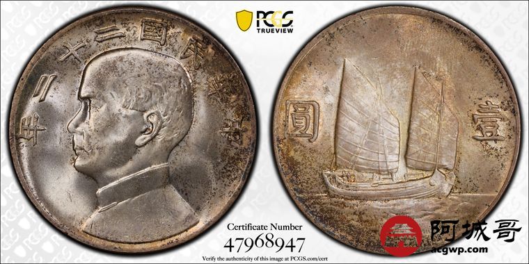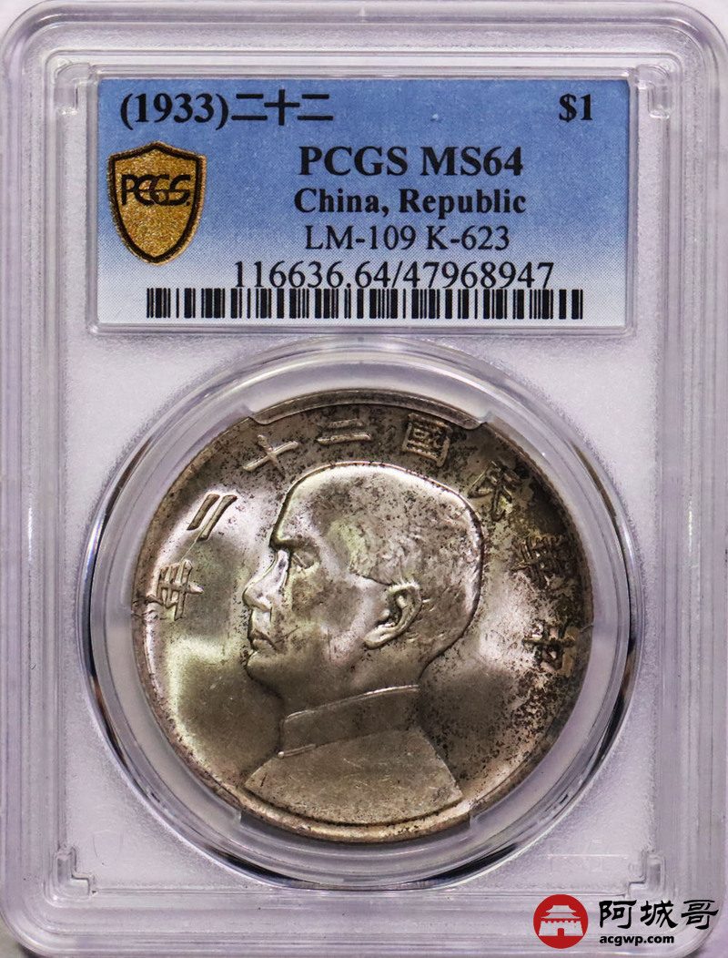 Lot:3 原光五彩 纸袋包浆 二十二年船洋PCGS MS64
