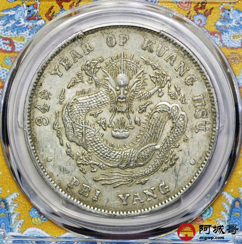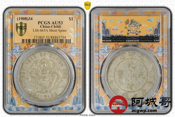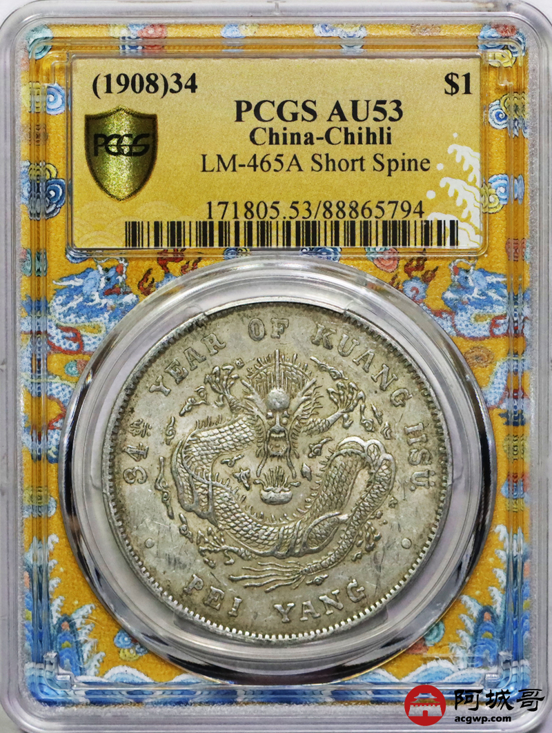 Lot:5 原汁原味 全深打 北洋34七钱二分 短尾龙 PCGS AU53