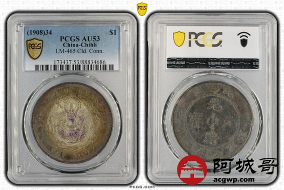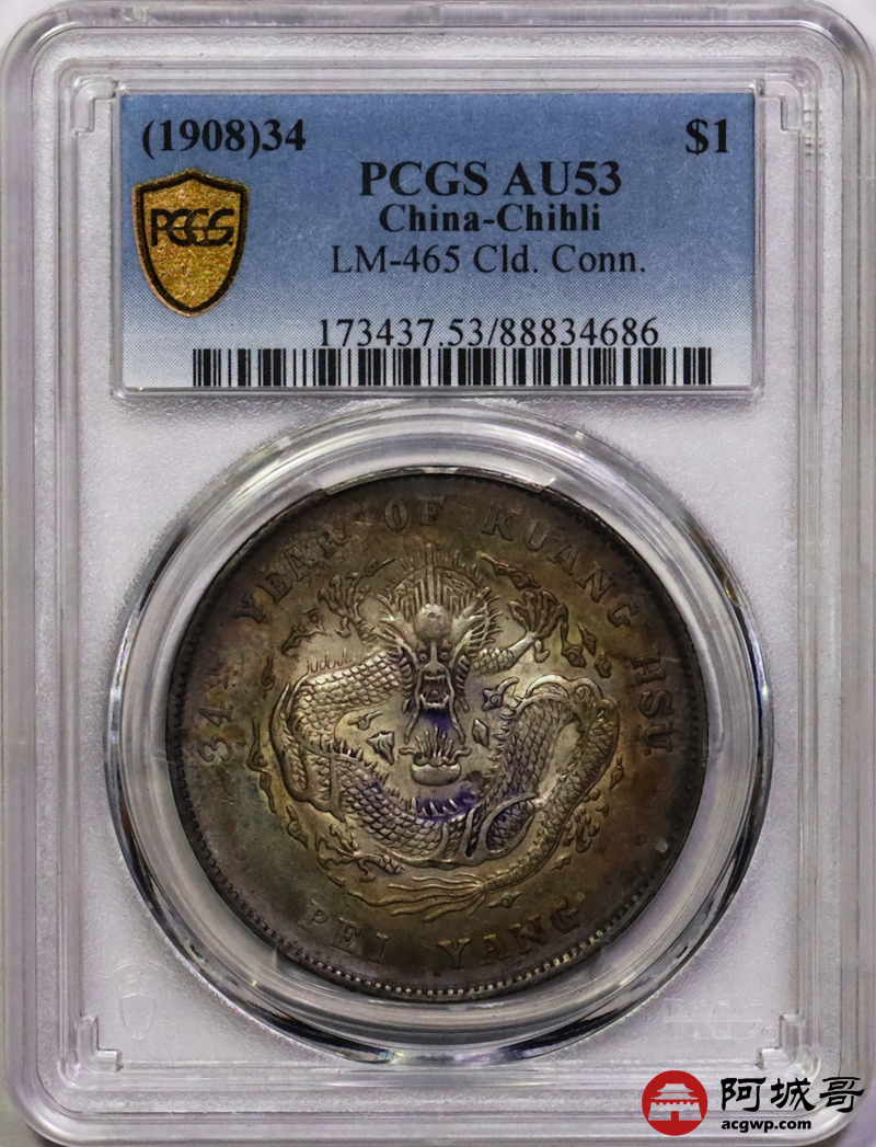 Lot:12 深打 环彩 背全彩 北洋34七钱二分 PCGS AU53