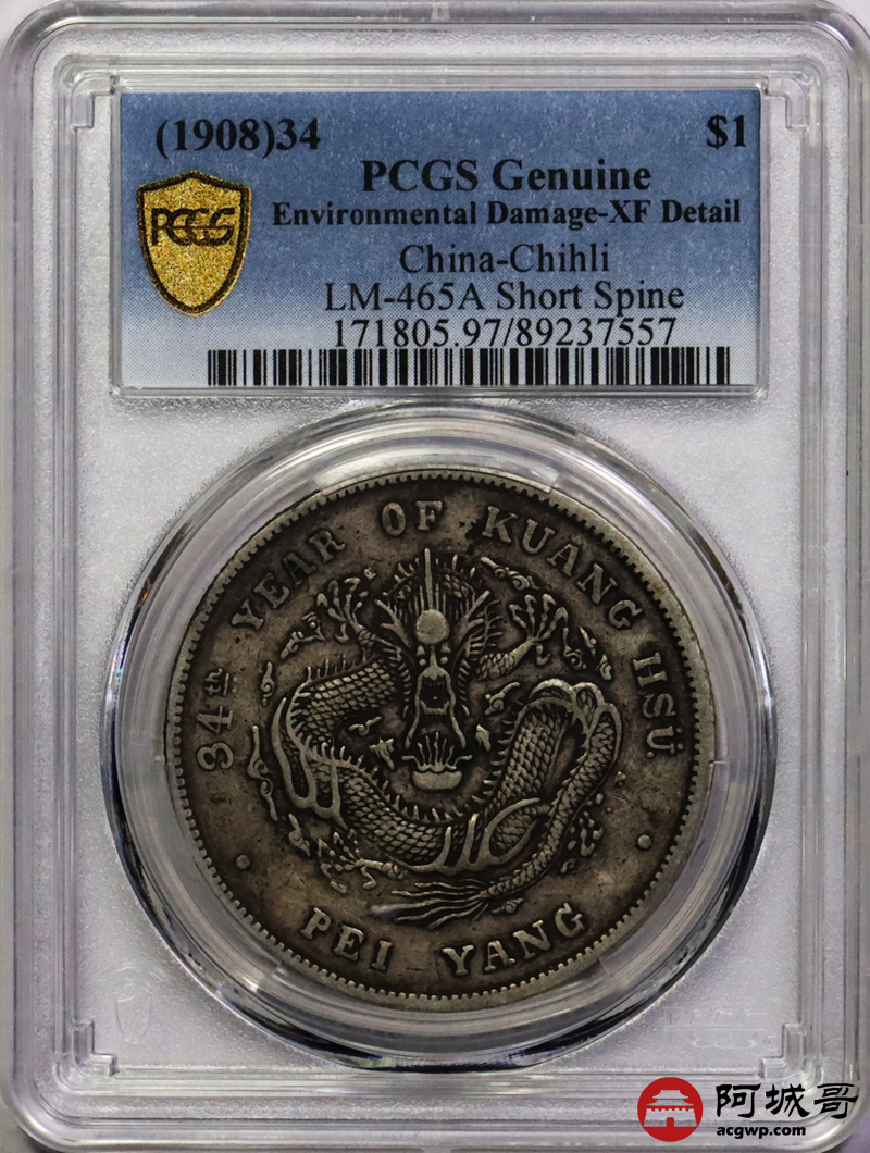 Lot:21 原味老包浆 北洋34七钱二分 短尾龙 PCGS XF
